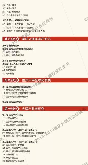 讓火鍋行業(yè)從業(yè)者更深入的了解重慶火鍋市場,讓重慶火鍋文化傳揚(yáng)全世界,是我們所一直倡導(dǎo)的?!吨貞c火鍋紅皮書》根據(jù)大眾點(diǎn)評和美團(tuán)網(wǎng)的數(shù)據(jù)收集,及對對重慶主城九區(qū)餐飲(火鍋)市場進(jìn)行了摸底式調(diào)研,分析餐飲(火鍋)類商戶的相關(guān)數(shù)據(jù)得出結(jié)果,為學(xué)習(xí)交流之目的,我們特將目錄公布如下以供試閱。